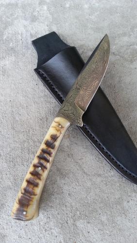 This full tang knife is random pattern damascus, with sheep horn handle material that is over 70 years old! It's a funny story how I got it and where it came from. This is a slender and very comfy knife. It probably gets looked at and handled more than any other knife at the store right now. A black leather sheath is included.