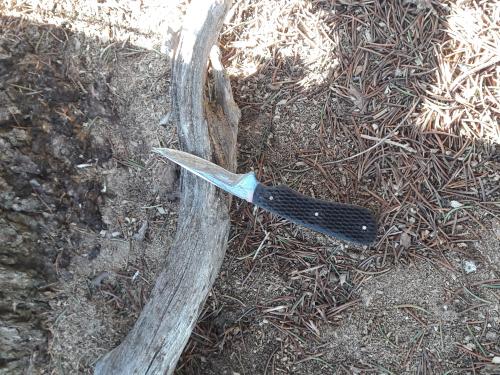 High carbon steel blade, rubber grip handle- awesome grip when wet. Sheath is included. This knife will rust, so keep it oiled between use!