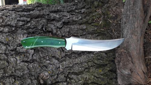 Med. Size hunter feels great in the hand, nice up-sweep for skinning. Fake jade with micarta spacer. 1095 high carbon polished steel. Includes black leather sheath. I can make another similar, but the Jade was a "close out" material, so it's gone. I also make a "Mini Ultimate Hunter", a smaller version of this knife.