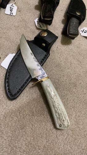 This knife is a smaller version of the "Pro Hunter" I make with a single guard. The blade is 3-3/4"--8" OAL Aprox. Stabilized Elk handle and brass guard. I can make these with your choice of handle materials, and choice of stainless or brass guard. Black leather sheath included.