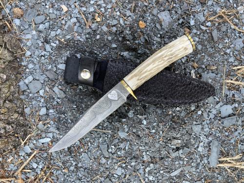Twist Damascus pattern welded steel blade 6 inches plus, stabilized Elk antler handle, brass accents. Beaver tail and black leather sheath included. I keep this picture and listing up, so you can see what's available on a custom order basis.