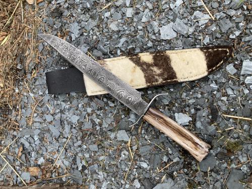 Random Damascus blade, Wildebeast handle with Zebra skin sheath
