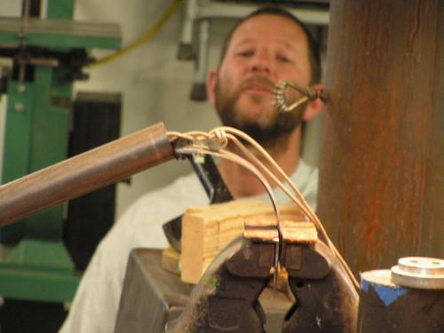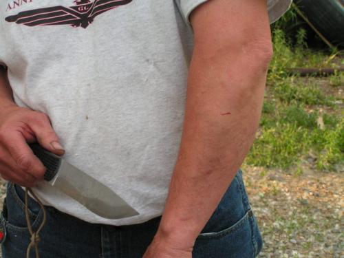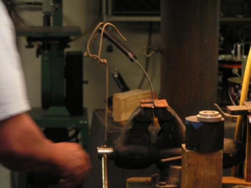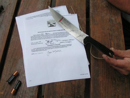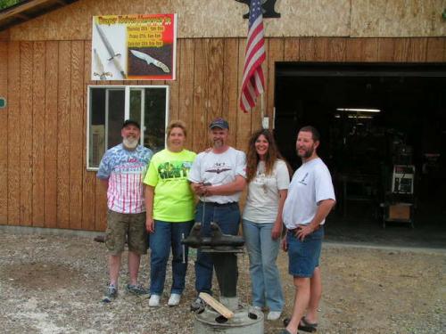 Here are some more pictures from the test, in the group photo, Kirk Rexroat is on the left, then Heather Harvey, then myself, then Audra Draper, then Kevin Harvey, All "Mastersmiths" with the American Bladsmith Society. I'm holding my "bent test knife". Now the next part of the test, is to make 5 knives that would reflect the style and quality, fit and finish that the ABS is noted for, and take those knives to the next "Blade show" in Atlanta Ga., for judging. If they pass approval, then I would be given my "Journeyman" knife maker status. It's a lot of work and trouble, but it IS worth the effort in the long run. --Jon