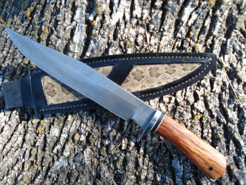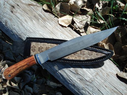 This picture is here to give my customers an idea of what I can make in the way of a large damascus bowie knife. Each large damascus knife will be slightly different, I used giraffe bone on this for the handle, I use lots of different materials from wood to elk antler to man made materials. Let me know what size and blade materials you would like- damascus or high carbon steel and I can work something up special for you. Thank you. JM